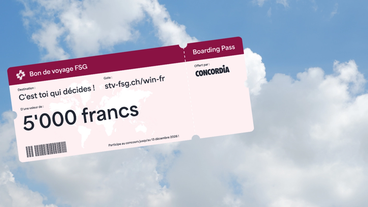 Participe dès à présent au concours FSG 2026 et remporte des super prix comme, par exemple, un bon pour un voyage d’une valeur de 5'000 francs ! Remplis le formulaire ci-dessous et tu seras immédiatement inscrit !