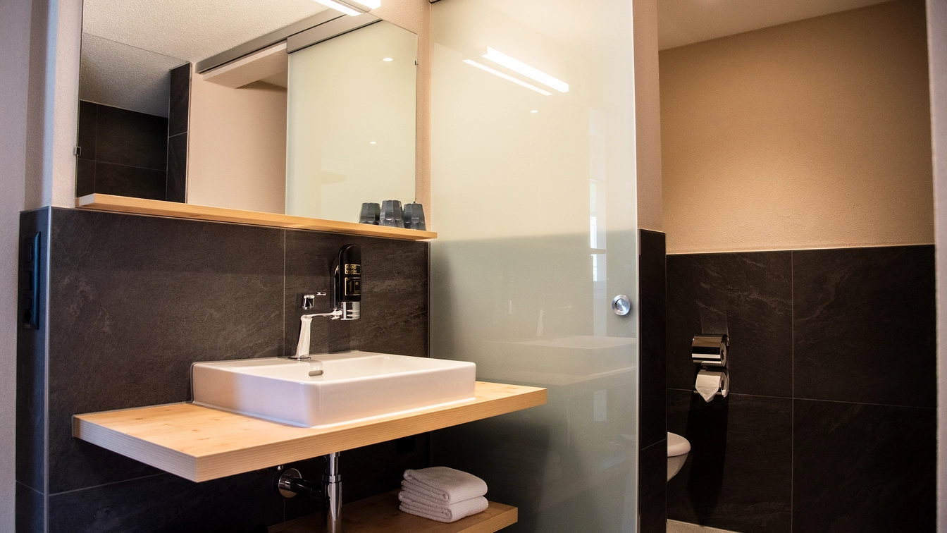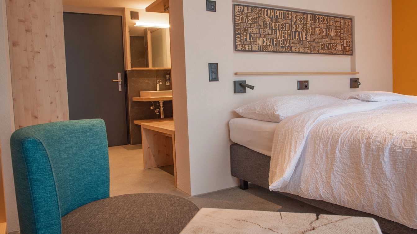 Dans ces chambres, tout tourne autour de la face: de la face nord de l'Eiger et de ses grimpeurs, et aussi: de la paroi de séparation avec la salle de bain. Car dans la partie chic, chaque chambre a sa propre douche et ses propres toilettes. L'histoire inspirante de la face nord qui t'attend dans ta chambre reste un secret jusqu'à ce que tu arrives.