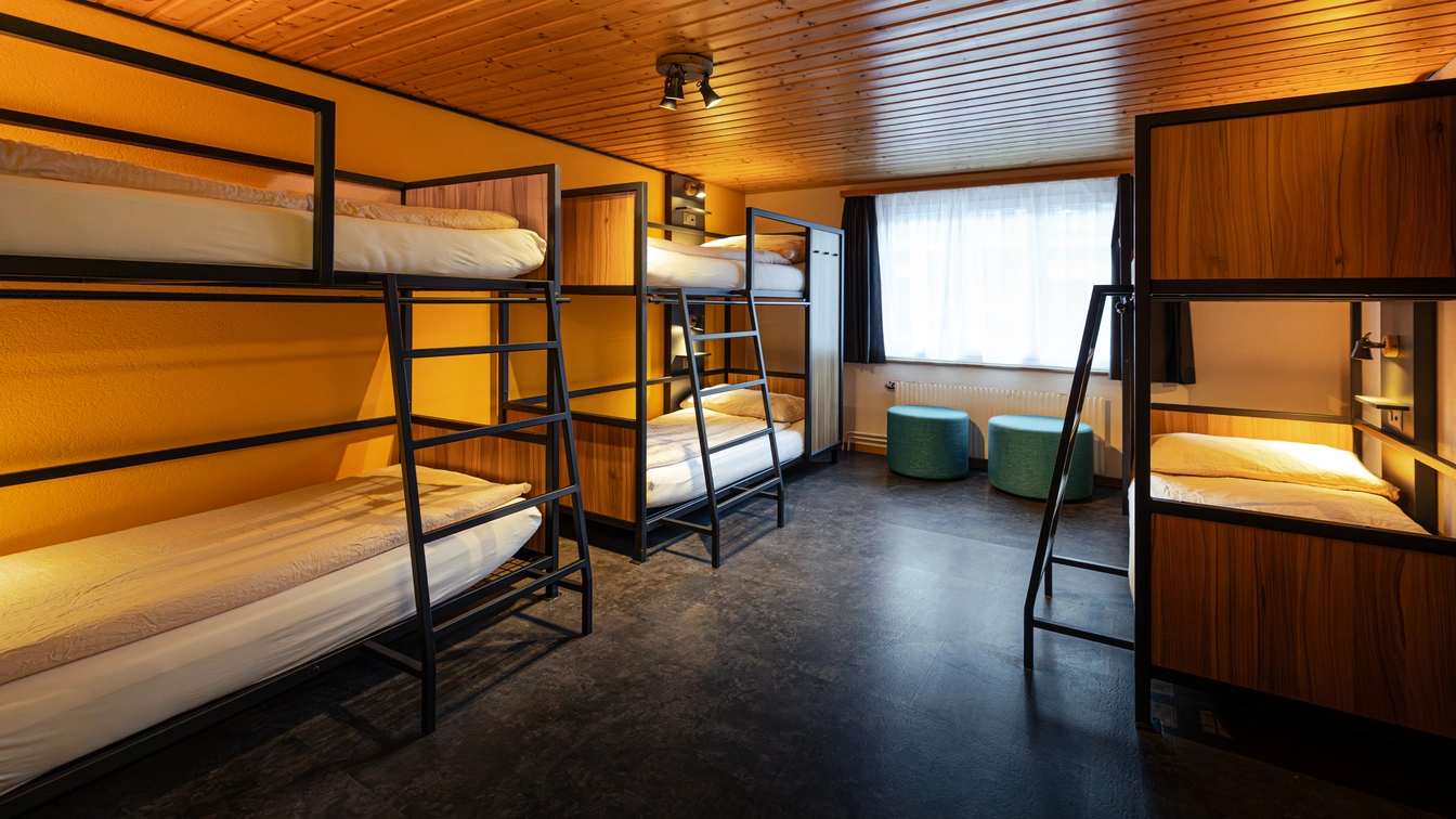Chambre double, chambre à 4 lits, chambre à 6 lits ou lit simple: toutes nos chambres sont équipées d'un lavabo, d'une armoire qui ferme à clé et d'une lampe par lit. Les douches et les toilettes se trouvent à l'étage (rez-de-chaussée). Il est possible de réserver des lits individuels ou des chambres entières. Chaque réservation comprend un petit-déjeuner copieux.