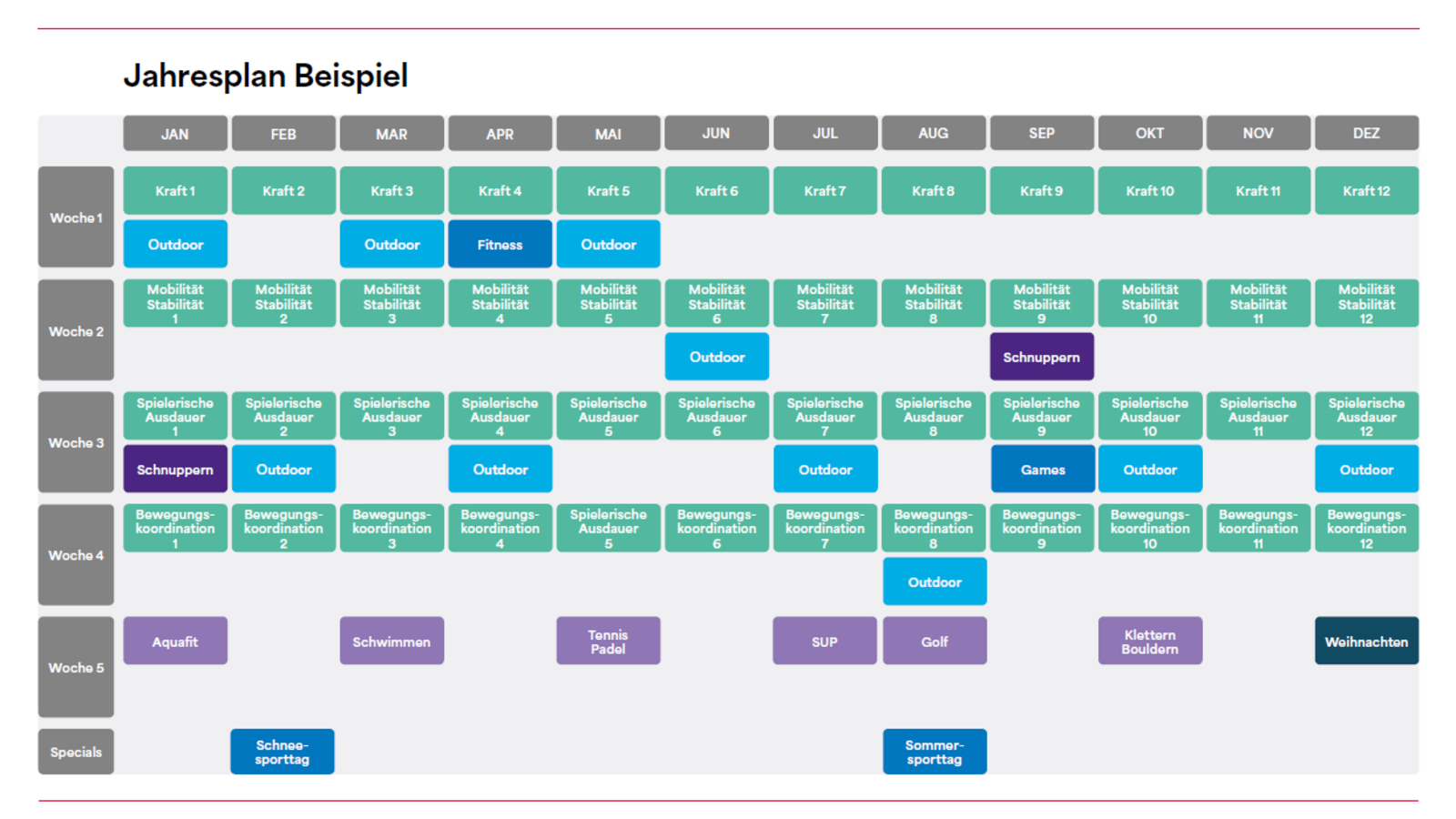 Wie das Jahresprogramm dann zusammengestellt wird, ist den Leitenden selbst überlassen. Man kann das komplette Jahresprogramm übernehmen oder einzelne CONCORDIA Fitiva Lektionen kombinieren oder oder ein eigenes Programm zusammenstellen. Dazu steht eine leere Vorlage zur Verfügung.