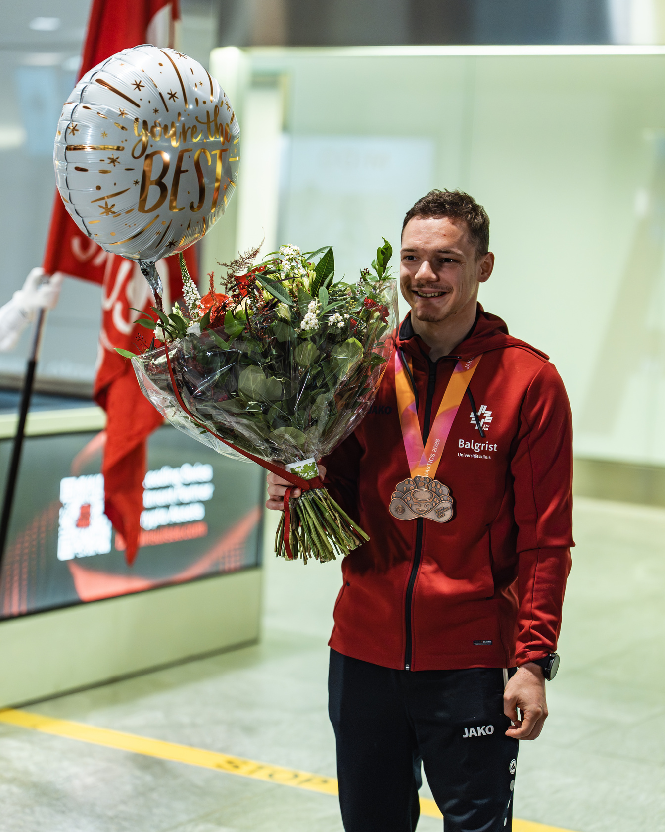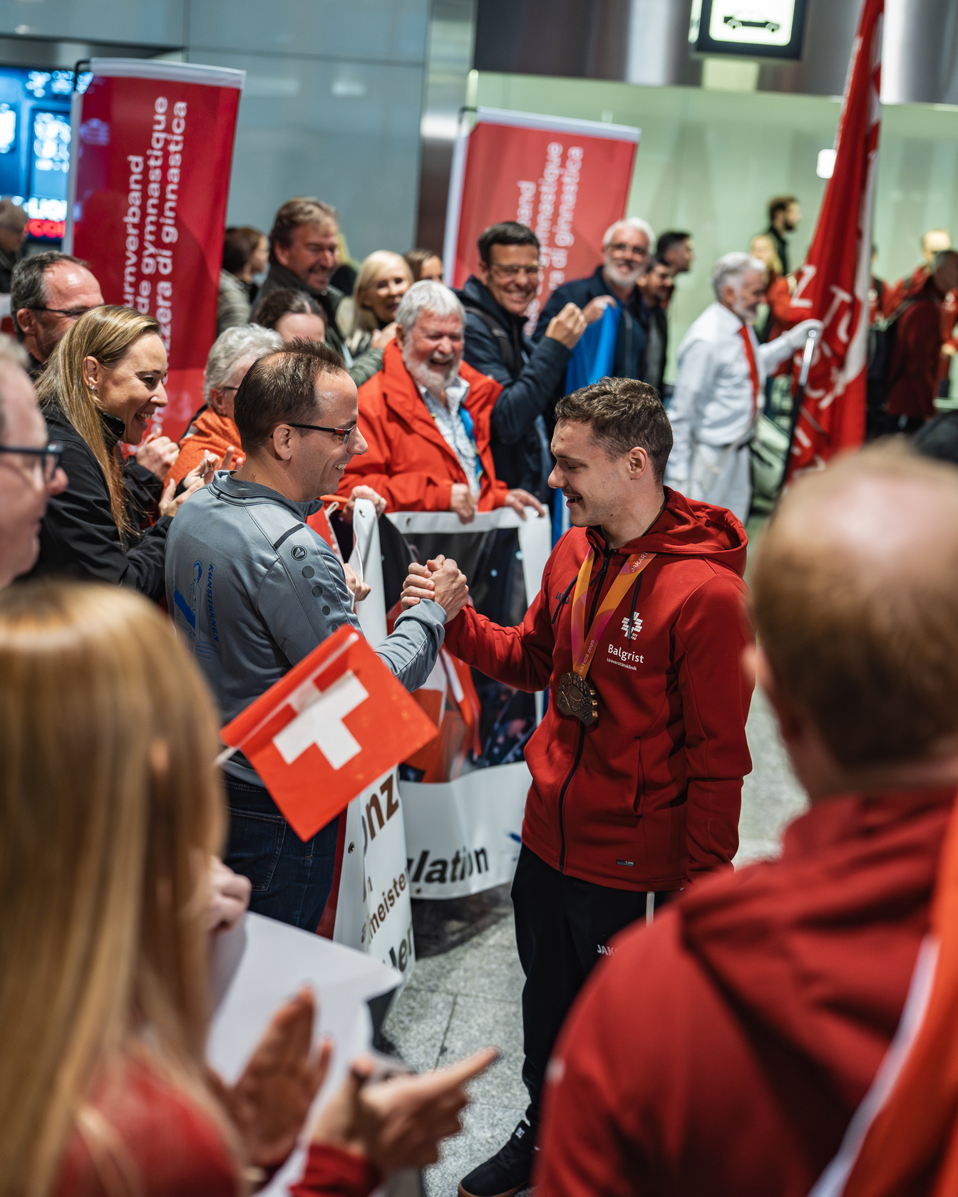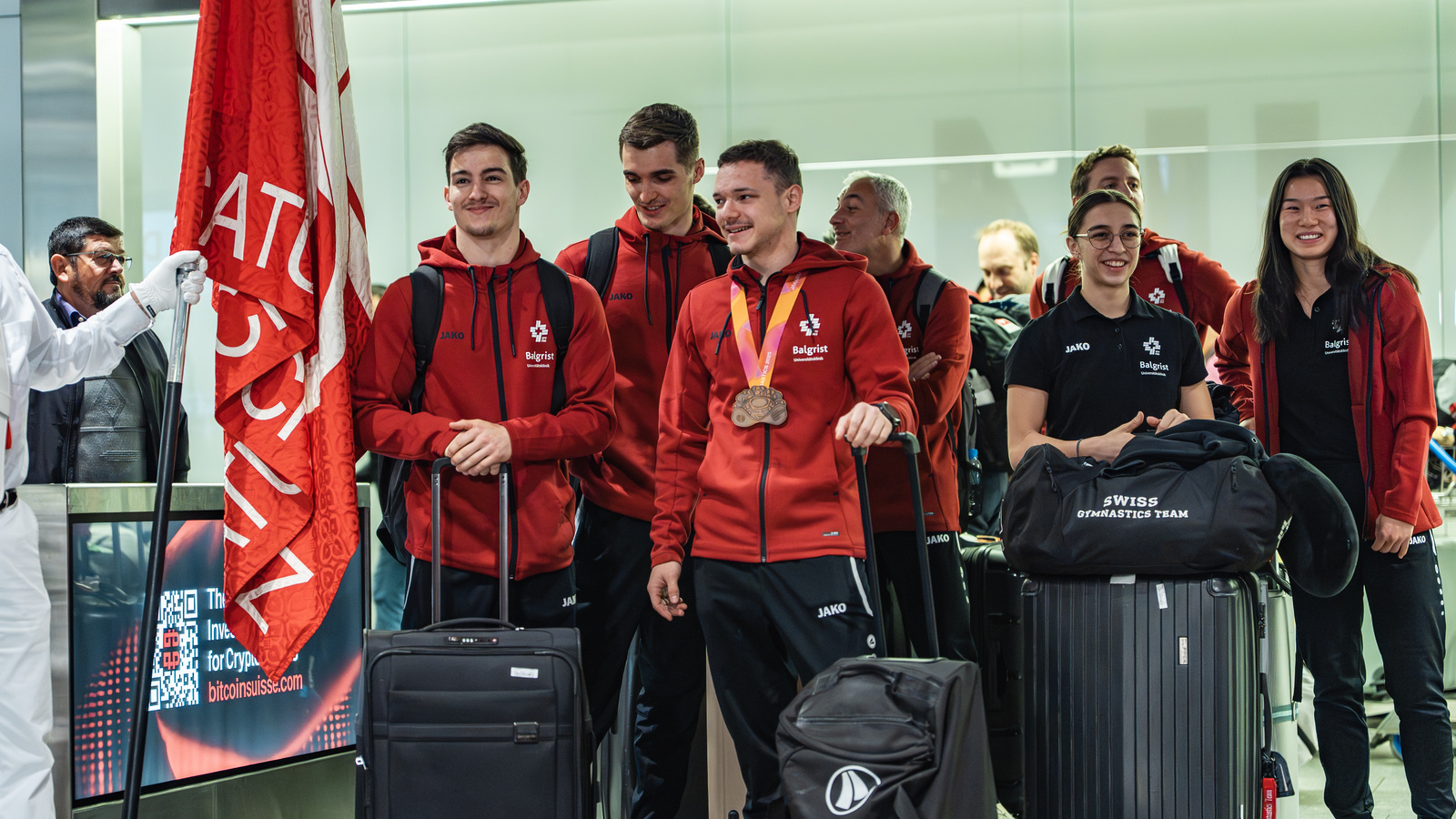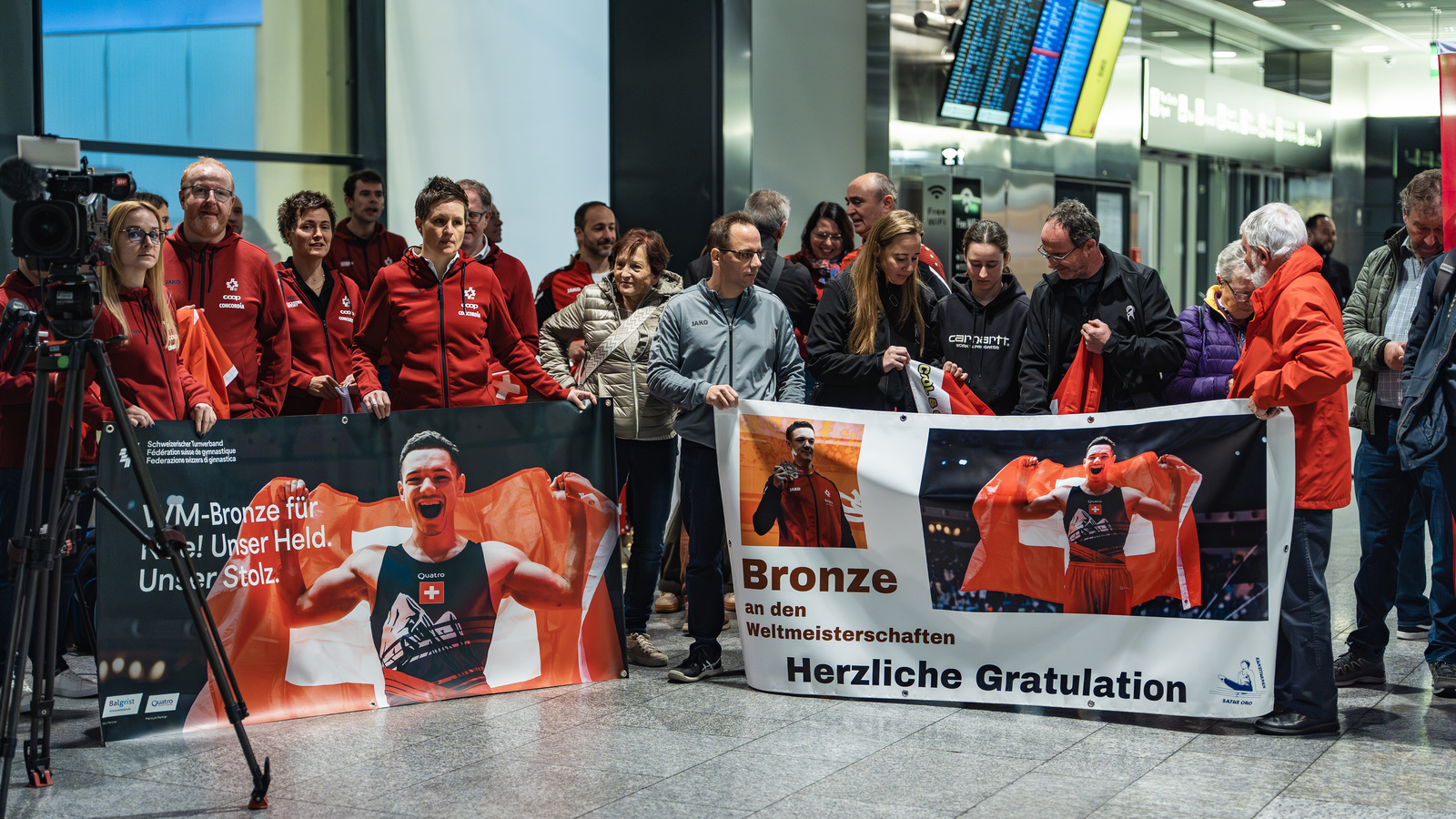 Am frühen Morgen wurden die Kunstturner*innen der Schweizer Delegation von knapp 100 Fans herzlich empfangen. Familie, Freunde, der Schweizerische Turnverband, der Aargauer Turnverband sowie Satus.oro bereiteten dem Team einen eindrucksvollen Empfang mit Blachen und zahlreichen Schweizer Flaggen. Die gesamte Delegation wurde für ihre Leistungen gefeiert.