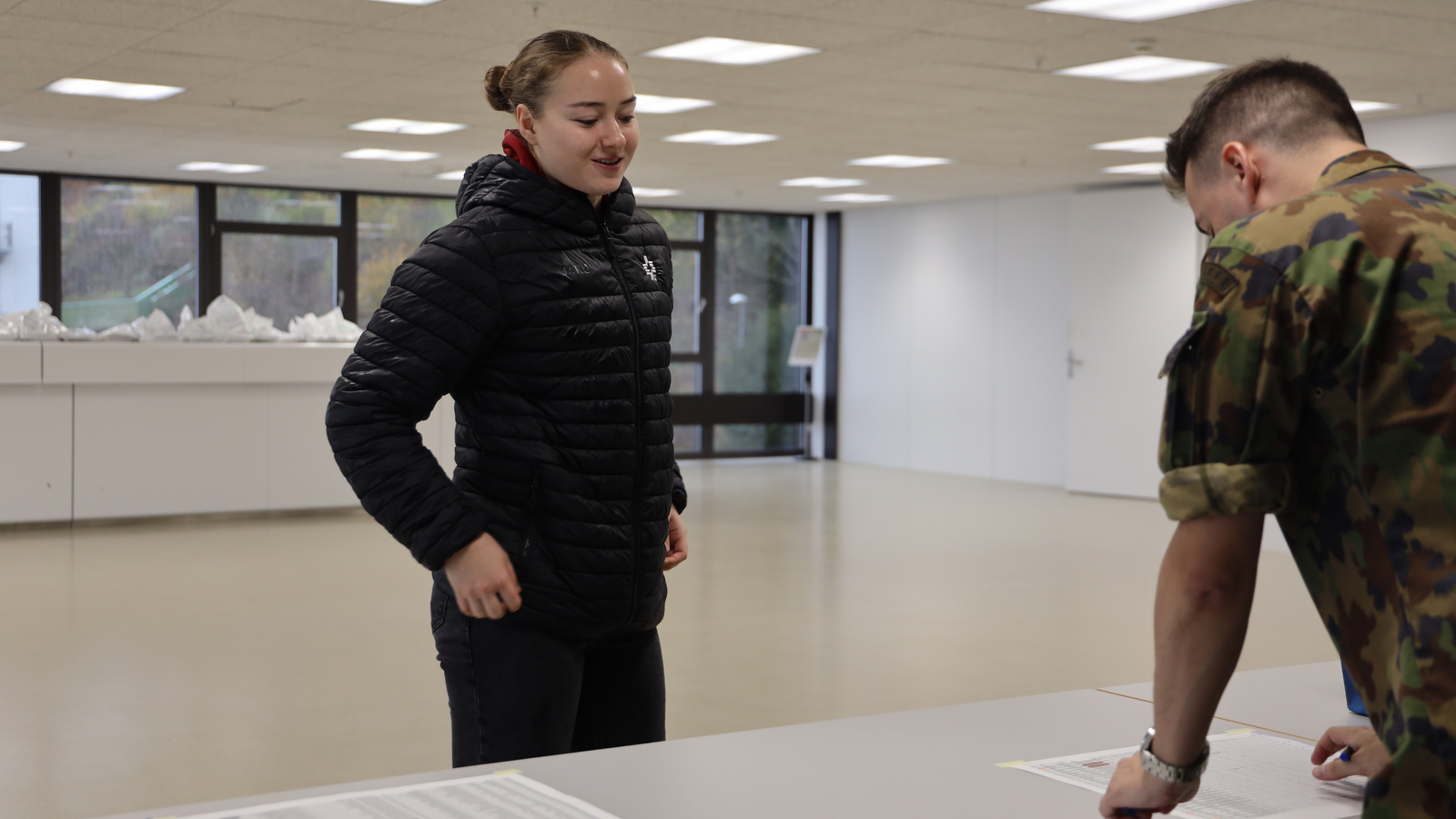 Die Sportler*innen mussten alle ihre Daten kontrollieren und Fragen beantworten. Welche Sprache sie sprechen, ob sie die Erkennungsmarke und das Dienstbüchlein erhalten haben oder ob sie einen Führerausweis besitzen. Danach ging es in ein Klassenzimmer, wo sich alle dem Alphabet nach einordnen mussten. Unter ihnen auch zum ersten Mal ein Trampolin-Athlet: Gonçalo Morais de Sousa Alves wird während rund sieben Monaten die Spitzensport-RS in Magglingen besuchen.